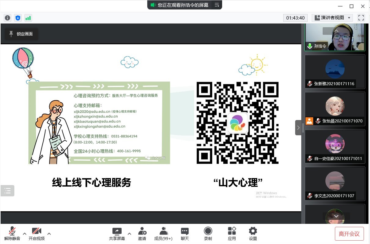 此次讲座有助于帮助同学们疏解情期间自己的压力,提升学生对疫情期间可能出现的心理问题的应对处理能力和对自我情绪的调控能力。学院始终心系学生,立足于学生的实际需求,积极组织开展“读书分享会”、“四点半课堂”体育系列活动、美育大讲堂、体育大讲堂等大众品牌活动,引导学生涵养健康向上的社会心态,用健康生活舒缓压力。在疫情防控关键时期,学院上下齐动员,同心共筑疫情防控“钢铁长城”,不断加强面对疫情的心理援助,为学生撑起心灵“保护伞”、穿好心灵“防护服”、织起心灵“防疫网”、戴好心灵“口罩”。