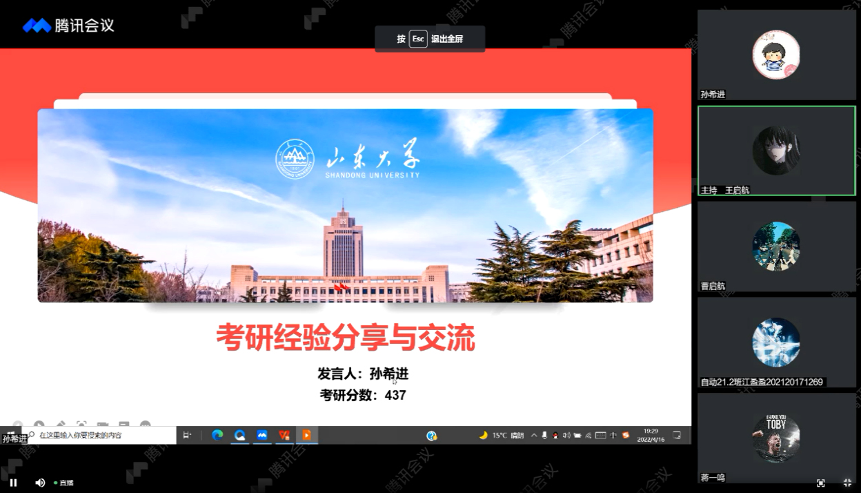 举办“青年说—师兄师姐谈考研”线上讲座,七位考研优秀学生代表依次讲述自身考研故事、分享考研经验、交流考研心得,200余位同学线上参加活动。